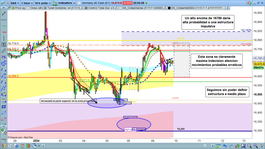 En gráfico de una hora del Dax40, ayer el precio no nos dejó ninguna pista clara sobre evolución futura. Se giró justo en el 123%, y tampoco confirmo quiebre de la Genial line, por abajo. Por tanto, paciencia para saber donde vamos en el medio plazo.