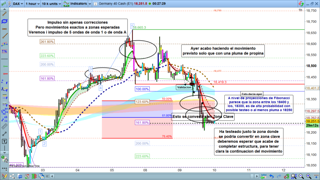 Por lo tanto, parece que los movimientos del día de ayer del Dax, caso de confirmarse ahora la continuidad de la estructura en curso, tanto si es una opción como la otra, podrían ser un claro adelanto de los movimientos estructurales que tendríamos durante las próximas semanas. Un poquito más de paciencia y a ver si tenemos suerte y durante esta semana acaba dejando claro cuál es la estructura en curso. Muchísima suerte y muy buenos trades.