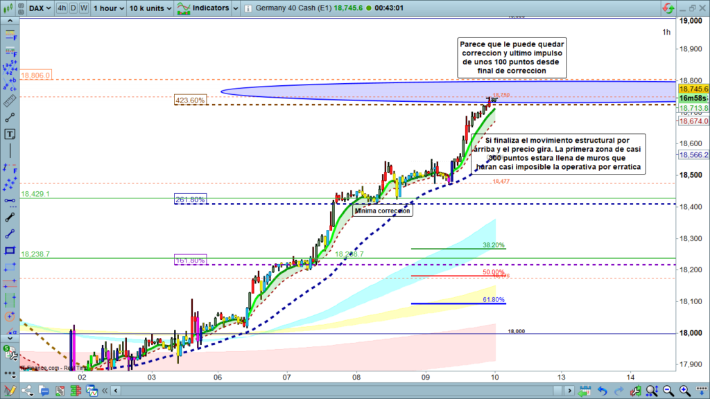 Resumiendo, si hay la posibilidad, ya desde primera hora de preapertura, de entrar en la continuación de impulso alcista, es muy probable que sea la mejor operativa del día, acompañar al impulso hasta que nos saque del mercado. Si se mantuviera la fuerza podríamos tener incluso una pluma superior por encima de la zona ya marcada en los 18830. En cambio, si el precio finaliza el movimiento y a gira en forma correctiva, iremos chocando uno tras otro con todas las zonas de corrección genial y cintas del túnel. Muchísima suerte, si el mercado nos lo permite que hagáis muy buenos trades y sobre todo que paséis un fantástico fin de semana.