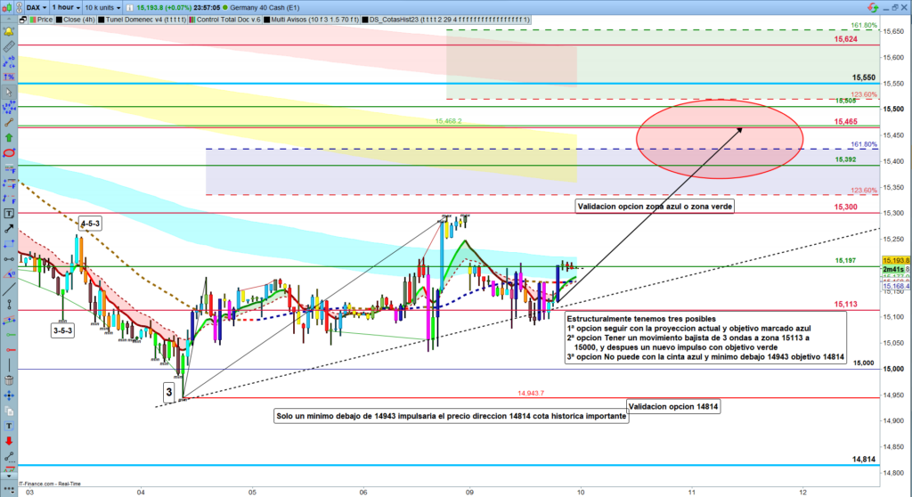 La primera zona de proyección, la que deriva del movimiento ya iniciado el pasado miércoles y con la onda de corrección que nos dejó la pluma del pasado viernes, esto nos proyecta, a la zona entre los, 15335, y los, 15425. Sí, en cambio, el movimiento de validación es el formado por un máximo en la zona de los, 15296, y el mínimo del día de ayer en los,15078, esta posible validación estructural nos proyectaría hasta la zona de los, 15520 a 15650. Con la zona de la cota histórica importante de los 15550, en medio de esta zona.