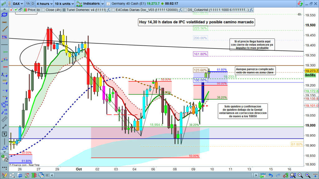 El mercado está en una situación complicada y la dirección más clara dependerá de cómo el precio reaccione durante la preapertura europea y, más importante aún, después de los datos del IPC. Los niveles clave son 19,400 para confirmar un impulso alcista o una ruptura por debajo de los 19,101 para validar la continuación bajista hacia los 18,850.