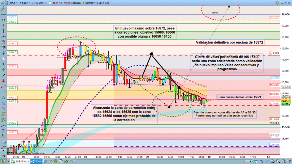 Veremos evolución en sesión asiática. La zona final de esta corrección, es la zona entre 15624, ajustando 15596 (123,6%) y los 15525 (161,8%), y en medio de esta zona, la cinta azul al inicio del día entre los 15581 y los 15565. como podéis ver la zona casi testeada ayer en la vela de las 22 h. En sesión asiática, podemos ver como completa la corrección, o se queda en zona consolidando en torno a los 15624, esperando la volatilidad de la pre apertura y apertura del parquet las 8 h y las 9 h.