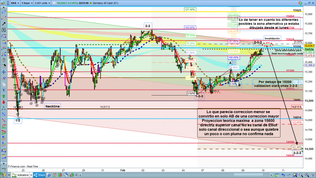 Para hoy, el dibujo de la estructura de ayer, nos ha llevado a aclarar los conteos en curso. La opción más probable, visto lo visto y con los dibujos de ayer. Es que las ondas anteriores sobre las que aún había dudas, fueron 1-3 y 2-3, la última bajada hasta los 15056 el pasado viernes fue onda 1-3-3, y la corrección desde entonces, y que finaliza en sesión asiática de hoy, o quizás en la apertura de hoy, haya sido onda 2-3-3. En el caso de que este escenario, el más probable sea el correcto, el próximo movimiento debería ser muy fuertemente bajista, para finalizar una onda intermedia, la onda 3-3-3, en la zona 14420 a 14560.
