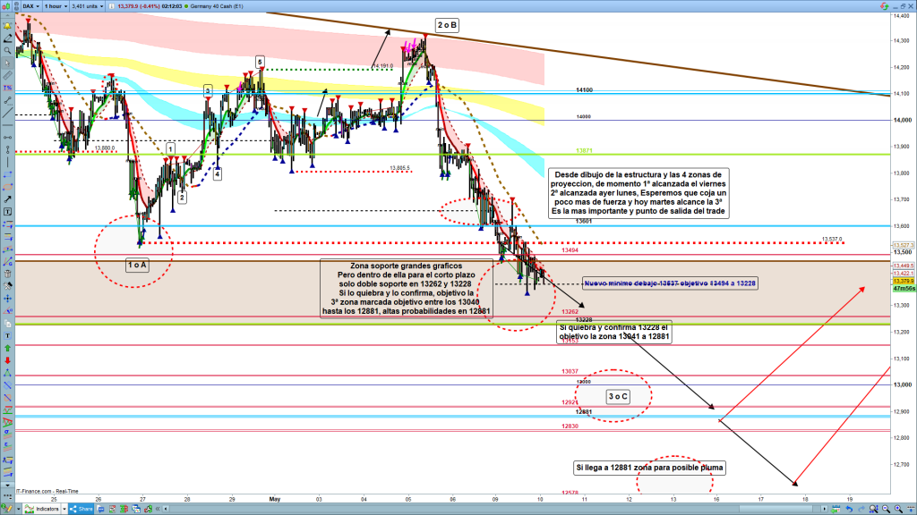 Para hoy camino claro hasta la zona de doble soporte con dos cotas históricas 13262 y 13228, Zona importante base de la amplia zona de soporte de gráficos grandes. Si la quiebra y confirma el quiebre con pullback por debajo de los 13228, al igual que ayer hizo dos veces a la 1 h, en asiática y a las 11 h, con la 13601. Entonces camino a la zona, objetivo principal del presente movimiento. La zona entre los 13040 y los 12881, con muchas probabilidades de llegar hasta los 12881. Es más, si llegara con fuerza, podríamos tener pluma rápida de final de movimiento hasta la zona 12700 a 12600. Si esto último ocurre, sería un detalle más para seguir pensando que seguimos en impulso bajista muy importante y que no es final de teórica posible corrección.