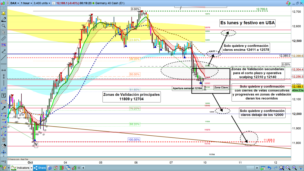 Después de la apertura semanal en la zona de los, 12184, por debajo de las dos cotas históricas gemelas, la inferior está en 12193, mucha atención al momento tanto de la preapertura como de la apertura del parquet con la vela de las 9 h. Ahí hoy más que otros días debido al festivo en Usa, es donde deberíamos tener ya la dirección y objetivos del día. Poco más a añadir a este pequeño análisis para el corto plazo, pienso que hoy, más que otros días, las proyecciones marcadas en el gráfico, así como la zona clave, son suficientemente claras. Muchísima suerte y muy buenos trades.