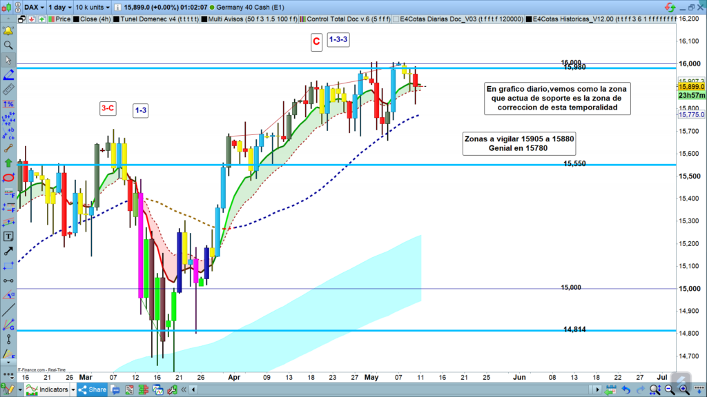 En gráfico diario, vemos como lo que está actuando de fuerte soporte y de momento lleva ya dos días parando la evolución bajista del precio, es la zona de corrección. Para tener recorridos más significativos, deberíamos tener un claro quiebre de esta zona de corrección, pero para ello necesitamos el cierre de dos días como mínimo por debajo de la misma, y que el segundo día el cierre sea en zona más baja que el del día anterior. La otra zona importante a tener en cuenta, es la zona de los, 15780 hasta los, 15744, fijaros que es la zona de la Genial line de diario, el quiebre de esta zona y su posterior confirmación, si que daría recorridos importantes bajistas de cientos de puntos.