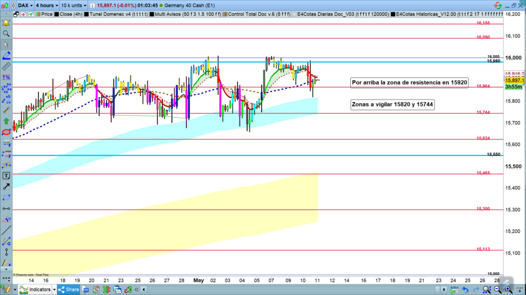 Así como en gráfico diario, sólo veíamos zona de soporte, aquí en gráfico de cuatro horas, también vemos zona de resistencia, si el precio superara y confirmara el quiebre de la zona 15920, inicialmente tendríamos, nueva subida hasta la zona de la cota 15980, de nuevo en la zona que está actuando de muy fuerte resistencia desde hace ya muchos días. Seguimos con el mismo escenario de los días anteriores, un nuevo alto por encima de los,16010, esta vez debería ser para un recorrido un poco más importante, a la zona de los,16045 a 16090.
