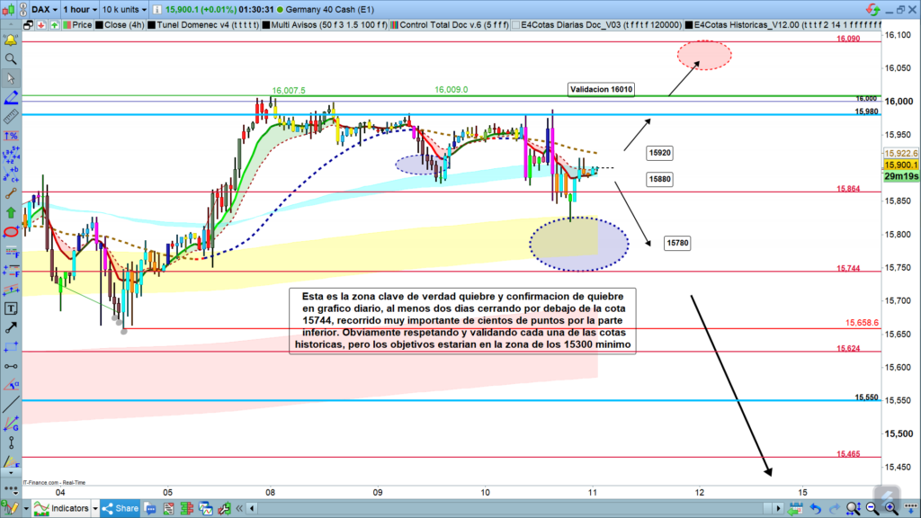 Si, en cambio, el precio vuelve a ser bajista y pierde la zona de los,15900 a 15880, sobre todo estos últimos, no solo atacaríamos de nuevo la zona de la cota histórica 15864, sino que posiblemente tuviéramos quiebre y recorrido bajista hasta la zona de los,15780, con muchas posibilidades de llegar a testear la cota de los, 15744.