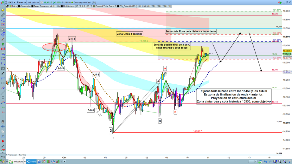 Si, por el contrario, después de testear la zona de los, 15550, el precio baja, pero solo es en corrección y el siguiente movimiento es un nuevo impulso en busca de nuevos máximos, atención porque tendríamos que contemplar de nuevo una doble posibilidad, y seguir operando día a día solo los tramos de recorrido de alta probabilidad hasta que acabe de enseñar el camino. Poco más a explicar en el día de hoy, por proporciones, y equilibrios, parece que la onda 3 de C, está ya muy adelantada si no finalizada, Por tanto, atención a la posible corrección menor, muy comentado hasta la zona de Genial line de H1 y posterior impulso a testear la zona de cinta rosa y la cota histórica importante y ya comentada también de los, 15550. Muchísima suerte y muy buenos trades.