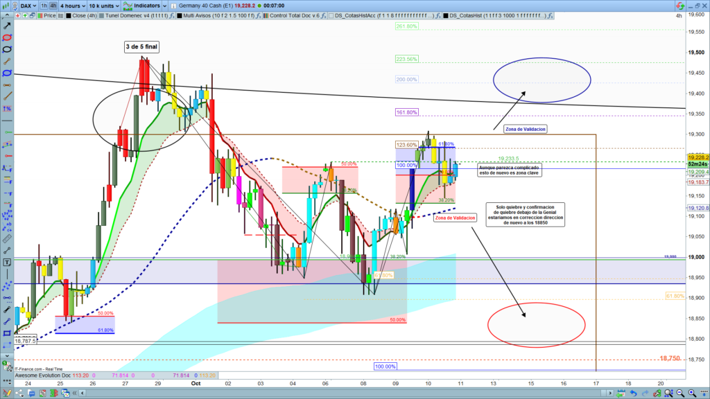 Ayer, apertura del día en la zona de los, 19273, para acabar cerrando el día en la zona de los, 19225, solo 50 puntos más abajo del inicio 24 horas antes. Día sin historia, sesión Europea bajista hasta la zona de corrección de gráfico de H4, para posteriormente con el dato del IPC de USA, durante la sesión americana ya con mercado cerrado, subir 25 puntos más hacia arriba. Ninguna validación, ninguna confirmación, por lo tanto, seguimos en zona clave.