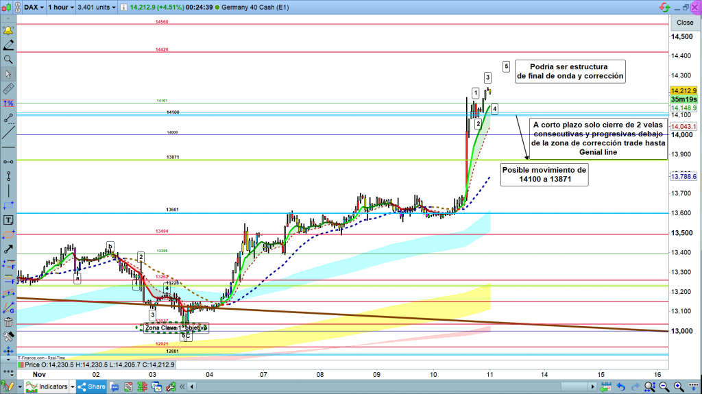 En gráfico de 1 hora del dax40, hoy muy poca información. En el corto plazo por arriba solo se ve la continuidad de la estructura actual, el pomo de final de estructura del velón. Acabada esta pequeña estructura, posible corrección, veremos si es suficientemente importante para perder la cota histórica importante de los 14100.