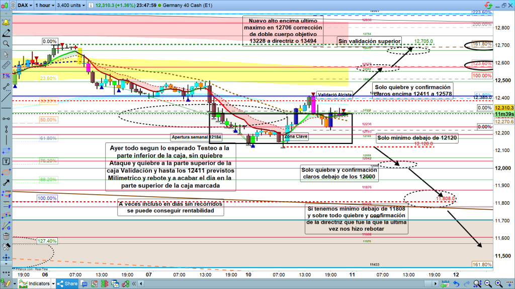Ayer, salió todo el movimiento, según lo esperado y explicado, en el Flash del domingo por la noche. Dibujada la caja entre los, 12140, por abajo, y los 12310, por arriba, cumplió perfectamente con los recorridos del día. Primero, bajada hasta la zona de la directriz inferior, en 12140, en el inicio de sesión asiática, y después en preapertura y en apertura de la sesión europea. sin quiebres y al final rebote. Al llegar a la zona de la directriz superior en 12310, quiebre y confirmación. Antes, ya en la zona de los 12250 al cierre de la vela de las 10h, por encima de zona de corrección de H1, no era clara validación, pero si para entrada de riesgo con técnica de scalping salió bien y dio ya un primer trade de 60 puntos. Después quiebre y validación por encima de los 12310, con paciencia dio una entrada muy buena en m12, en la zona de los 12315, en corrección, y objetivo claro los 12411. Testeo milimetrico y rebote, tal como anunciaba ayer diciendo que era lo más probable debido al festivo en Usa.