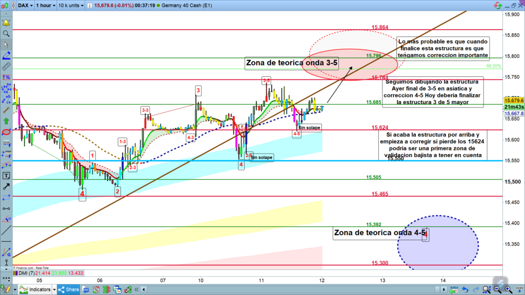 Técnicamente, lo esperable para hoy es finalización de la sub estructura en curso, la zona objetivo, es entre los 15744, y la zona de los 15820, aunque depende de la hora con volatilidad podría llegar hasta los 15864. Esta zona sin duda será clave, ya que si en esta zona tenemos un cambio de dirección, y entramos en rally bajista, la zona esperada sería la zona de los 15400 a 15250, esto daría aún más probabilidades a la posibilidad de estructura correctiva, con nuevo impulso y nuevo alto pero finalizando casi 7 meses de rally alcista. En el análisis semanal, cuyos links están en el post de arriba, se explica claramente estas posibles estructuras.