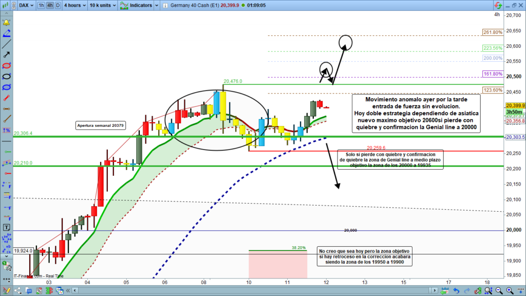 - Si el mercado mantiene el precio en rangos laterales sin romper las zonas clave (máximo anterior o Genial Line), el panorama continuará siendo incierto y dependiente de la apertura europea.