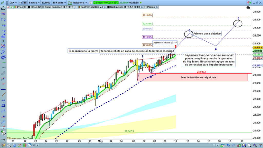Análisis diario Dax, tipo flash corto, lectura de 2 a 4 minutos, con las claves del día. Ondas de Elliot, estructuras de precio, zonas clave y objetivos.