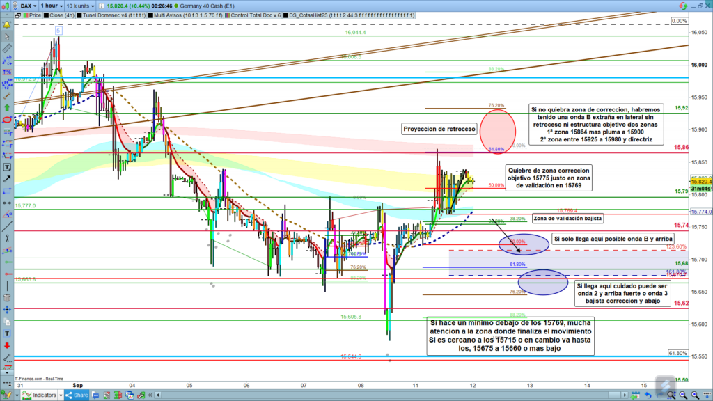 Deberemos dejar que el precio dibuje al menos una estructura reconocible, o una clara validación. Por arriba muy complicado porque si no quiebra la zona de corrección de H1, y sigue subiendo tenemos dos zonas objetivo, que van a hacer muy complicada la posible operativa. La zona de los, 15864 hasta los, 15900 con pluma para finalizar posible estructura, o si el primer rango fue onda B, pienso que debe de prevalecer la zona de retroceso como posible corrección entre los, 61,8% y el 76,2% o sea, entre los, 15864 y los 15930, si supera con cierres de velas esta última zona la cota de corto plazo de los, 15925, atención a posible movimiento fuerte alcista hasta los 15980 y la directriz.