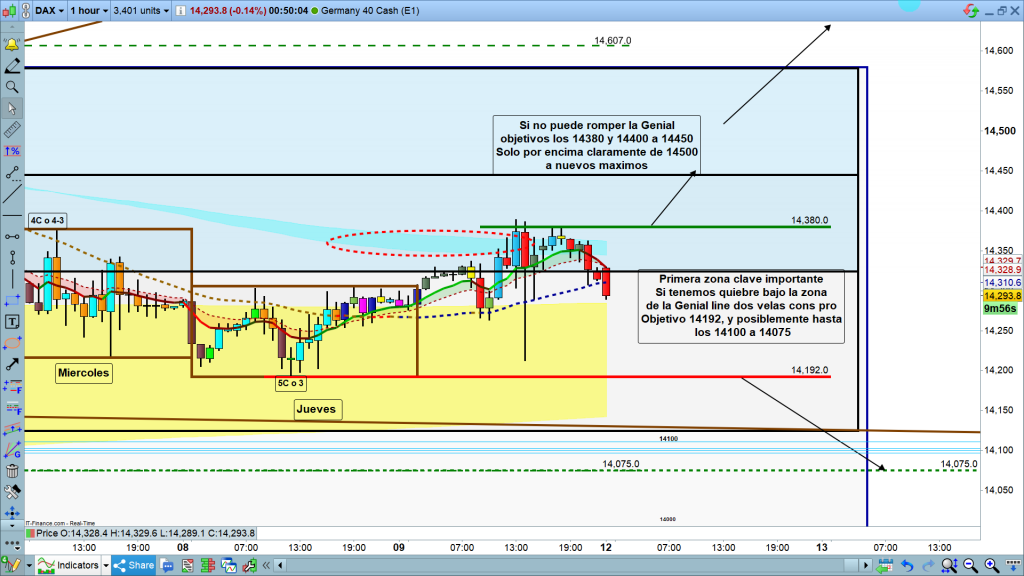 Sí, en cambio, el precio, no puede confirmar el quiebre de la Genial line, y rebota y sigue evolucionando por la parte superior, el primer objetivo será la zona de corrección y cinta azul de gráfico de 1 hora. Seguidamente, todo y la resistencia de esta zona, la zona clave de validación alcista en los 14380, aquí si precisaremos quiebre con cierre de velas, dos consecutivas y progresivas por encima de los 14380. para un primer objetivo hasta la zona de los 14400 a 14450.