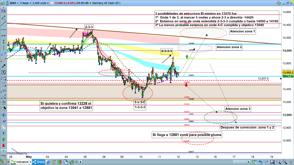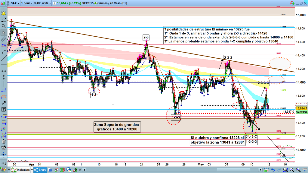- La bajada ha sido, como ya ha pasado otras veces en los últimos 6 meses, ondas extendidas dentro de extendidas, o sea onda 1 de 3, 2 de 3, 1 de 3 de 3, 2 de 3 de 3, 1 de 3 de 3 de 3, y ahora en este momento estaríamos en onda 2 de 3 de 3 de 3. posiblemente acabada o a falta de un nuevo máximo, hasta la zona 14000, máximo, pluma hasta 14100, para a partir de aquí encadenar diferentes ondas 3, consecutivas, no solo hasta 12881, sino seguramente hasta nuevo mínimo debajo de los 12411.