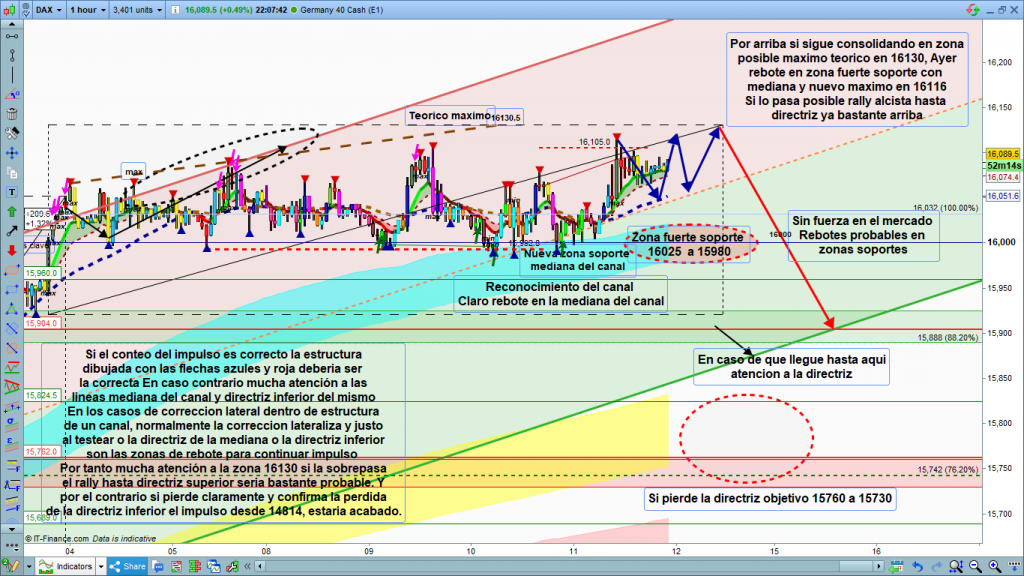 Para hoy, los puntos clave son claros, de entrada la mediana del canal, como referencia a las 14 h, pasara por la zona 16070. En el caso de perder esta zona, la zona de soporte fuerte que ha estado aguantando al precio durante todo este tiempo, hoy la tenemos en 16025 a 15980. En alguna de estas dos zonas, si es que el precio llega, debería de rebotar de nuevo. En el gráfico estructura posible a efectuar por el precio en flechas azules, La zona clave por arriba los 16130.5. En el caso de que el precio superara esta zona campo abierto para recorrido por la parte superior buscando la directriz que ya está en la zona de los 16250. Si el precio perdiera las dos zonas de soporte marcadas sin haber superado los 16130, objetivo directo a directriz inferior. En el gráfico creo que están explicadas las diferentes posibilidades de una forma entendible. La clave que entre algo de fuerza para romper una de las dos zonas que están actuando como resistencia y soporte dejando solo un pequeño rango casi inoperable para operaciones de intradia. Muchísima suerte, muy buenos trades, aunque sean en scalping, y muy buen fin de semana.