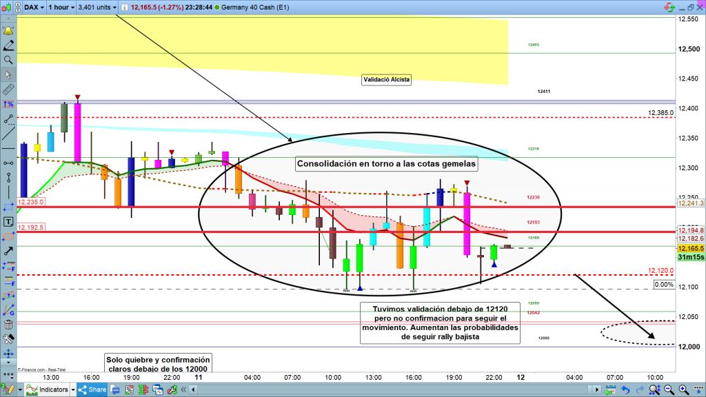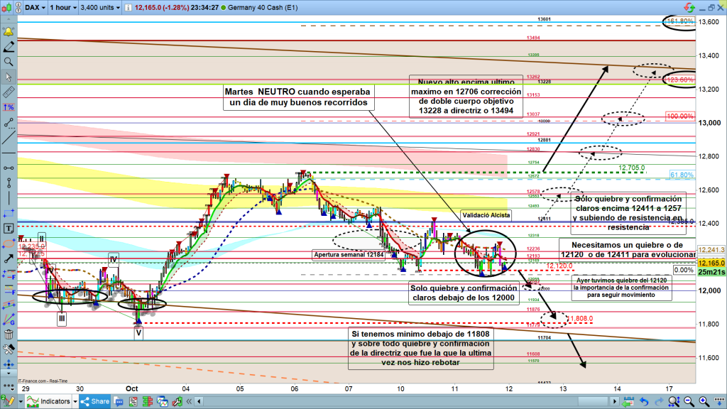 Para hoy mantenemos casi el mismo escenario que ayer, solo que la posible corrección, a 12690, sin nuevo máximo, para seguir bajando, ha desaparecido. Ahora si se pone encima de los 12411, lo más probable es que sigamos primero a validar en los 12705, y después a finalizar movimiento entre los 13228 y los 13494, es más con fuerza, en aquel momento podría llegar hasta la zona de los 13601. En cambio, si valida la perdida de los 12120, ayer ya tuvimos el quiebre, falta la confirmación con cierre de velas por debajo. Movimiento de soporte en soporte 12042 a 12000, 11876, y ya la directriz que hoy coincide del todo con los 11779, quiebre y confirmación, aquí, también como en los soportes anteriores, con dos velas consecutivas y progresivas, nos vamos ya a zona soporte/resistencia de grandes gráficos 11704 a 11433 con 11608 en medio de la zona. Muy poco más, hoy, como ayer, la imagen del gráfico es muy clara. Muchísima suerte y muy buenos trades.