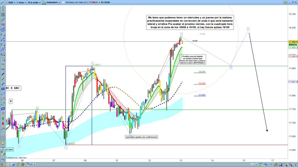 La otra opción,es que después de la estructura dibujada después de los datos de IPC de USA sigamos en impulso alcista para finalizar esta onda 3 de 5 en la zona de los, 18130, luego corrección durante la tarde de miércoles y todo el jueves y un último impulso hasta la zona quizá de los 18290, el próximo viernes.