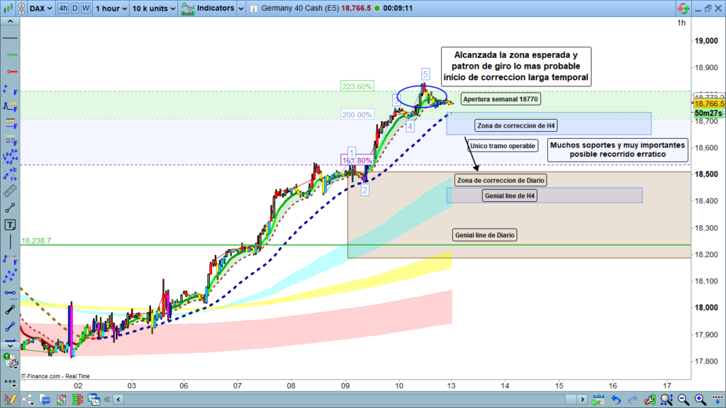 En gráfico de una hora del Dax 40, la situación parece bastante evidente. El movimiento alcista ha llegado hasta la zona esperada, ha dejado dibujado, un patrón de giro, para empezar posiblemente una importante corrección.