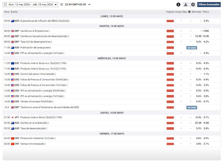 Publicado lunes 13 de mayo de 2024, a las 00 h UTC. Las horas del Calendario Económico, son UTC+2.