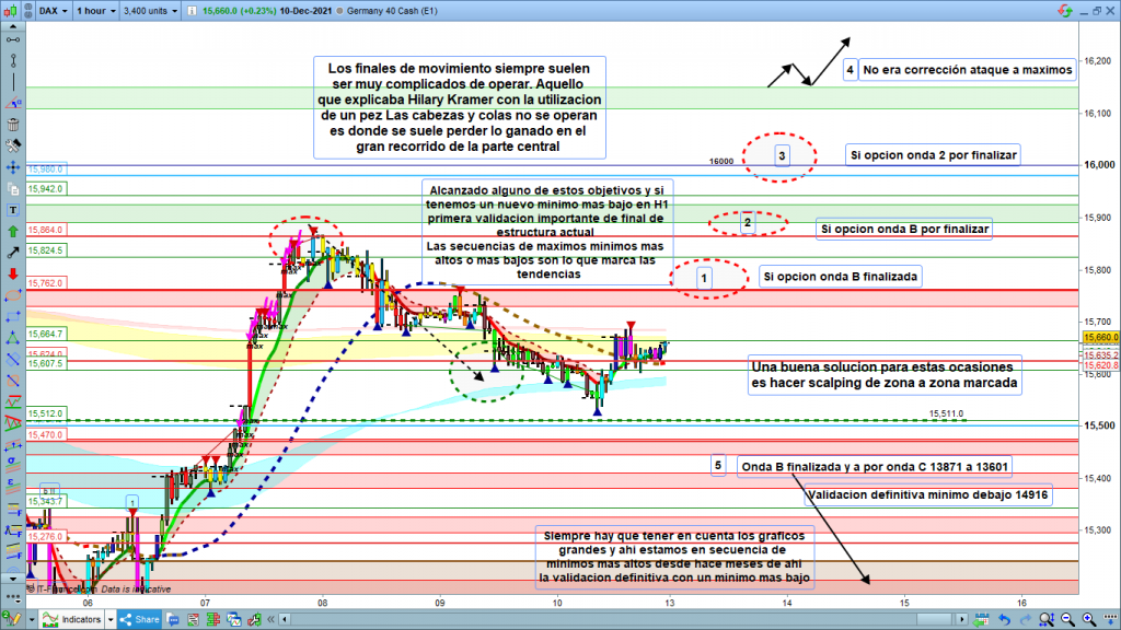 Este análisis es más para el corto plazo más inmediato, la operativa del lunes básicamente y si esta, es con muy poca fuerza y sin acabar de finalizar los recorridos, quizás para el martes también. Es el complemento del estudio del fin de semana. Análisis general del dax 12 diciembre 2021. Imprescindible su lectura para entender el flash de ahora.