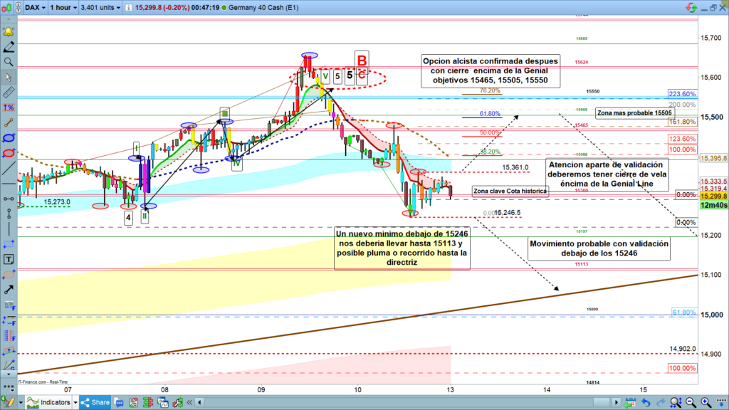 La operativa es clara, necesitamos validación para poder tener más probabilidades de éxito en nuestra operativa. Tenemos dos opciones, la inferior es estructural, o sea con un mínimo, aunque sea con un punto debajo del mínimo del viernes en 15245, el movimiento más probable es continuar impulso bajista hasta la cota de los 15113, cota histórica diaria. El objetivo principal es la directriz que pasa por debajo, pero ya veremos, si llega el precio hasta aquí, con que fuerza lo hace, de momento parece alejada de la directriz para ser alcanzada con una pluma.
