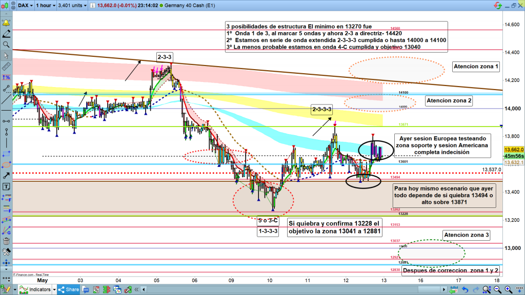 Ayer, día completamente neutro. inicio del día en zona 13650, cierre del día, parece en la misma zona. Durante sesión Europea, estuvo intentando quiebre de 13494, para evolución bajista, rebotando una y otra vez. En sesión americana, 8 velas consecutivas de cambio de secuencia, más indecisión imposible. Para acabar el día, como explicaba en la misma zona de la apertura. Día sin historia.