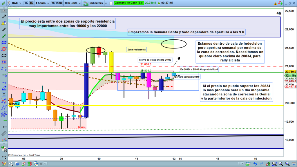 El análisis técnico del DAX indica que el mercado se encuentra en una fase de indecisión crítica. La apertura europea y la capacidad del precio para romper los niveles clave (20,834 y 21,000) serán determinantes para definir la dirección futura. En ausencia de un quiebre claro, es recomendable mantener una postura cautelosa y esperar señales más claras antes de tomar posiciones.