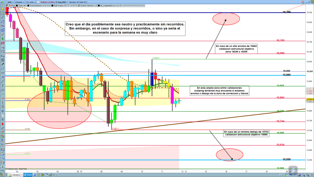 Si, en cambio, el precio, consiguiera quebrar la zona de corrección, hacia arriba aquí la cosa se complica porque la zona está llena de resistencias importantes, ya desde los 15900 hasta los 15925, coincidentes además con la Genial de H1, tenemos la zona de corrección y la Genial de H4. Y aunque consiguiera quebrar todo, aún tenemos la cinta azul de H1, y la cota histórica importante de los, 15980, que tantas veces ha estado parando el precio. Por tanto, en un día sin fuerza quebrar esta potente zona parece tarea muy difícil e improbable. Muchísima suerte y muy buenos trades.