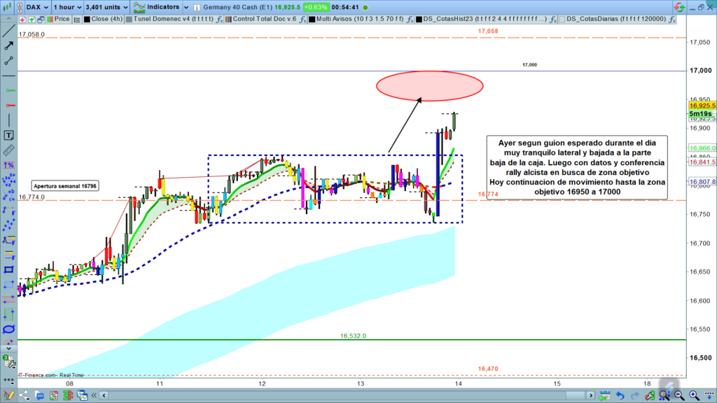 Ayer, dos partes claramente diferenciadas, tal como se esperaba, primera parte del día en rango completamente lateral y no fue hasta la vela de las diecisiete horas de cierre de mercado europeo, que el precio salió de la zona de rango para hacer un pequeño rally bajista hasta la parte inferior de la caja marcada en el flash de ayer, la mente, la zona de los, 16736. Justo a las veinte horas con el «buenas tardes» de Powell, el precio ya empezó movimiento alcista importante para acabar cerrando el día en la zona de los, 16927, casi 200 puntos en apenas cinco horas.