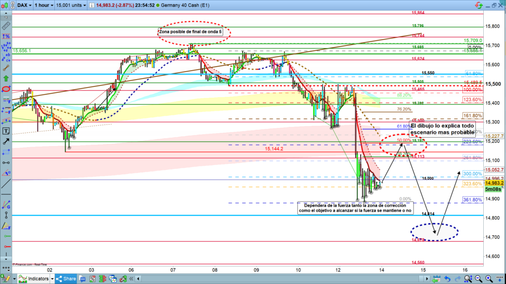 Independientemente, de lo que se mueva o de cuando se mueva el mercado, lo que parece claro son los posibles recorridos a realizar. Corrección que dependiendo de la fuerza puede llegar hasta un nivel u otro, más o menos desde la zona de los 15113, hasta la zona de los 15340, aproximadamente.