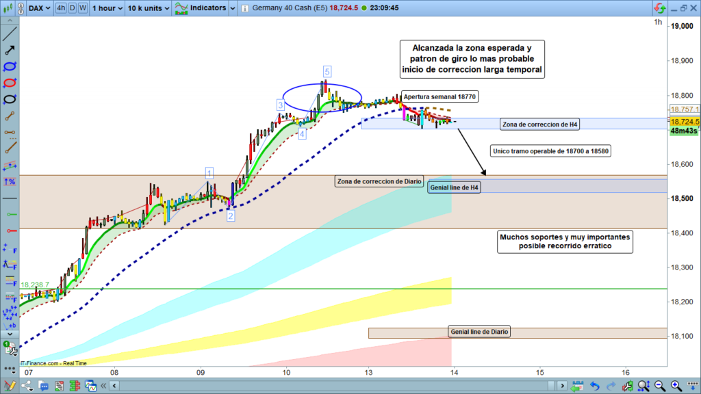 Análisis diario Dax, tipo flash corto, lectura de 2 a 4 minutos, con las claves del día. Ondas de Elliot, estructuras de precio, zonas clave y objetivos.