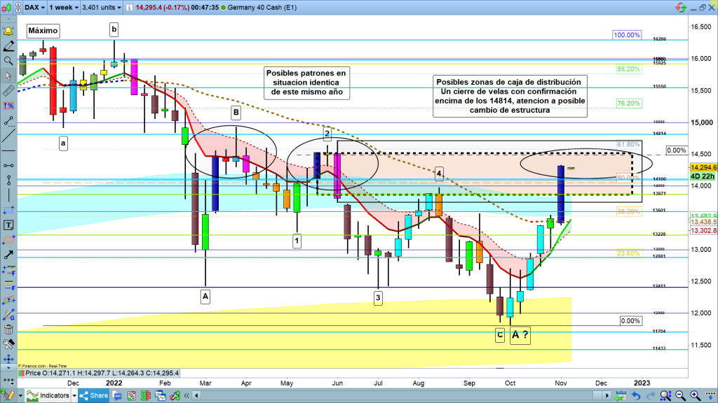 Si mi percepción es correcta, y tenemos que estar muchos días en la zona, por los motivos que he explicado y detallado en Análisis general del dax 13 noviembre 2022. lo más normal, serán largas consolidaciones en las cotas históricas y movimientos de corrección complejos con figuras de cinco movimientos o quizás más. con deambular errático y complicado, solo operativa en scalping por prudencia, por lo menos hasta salir de esta zona. Muchísima suerte, muy buenos trades y que tengáis una muy buena semana.