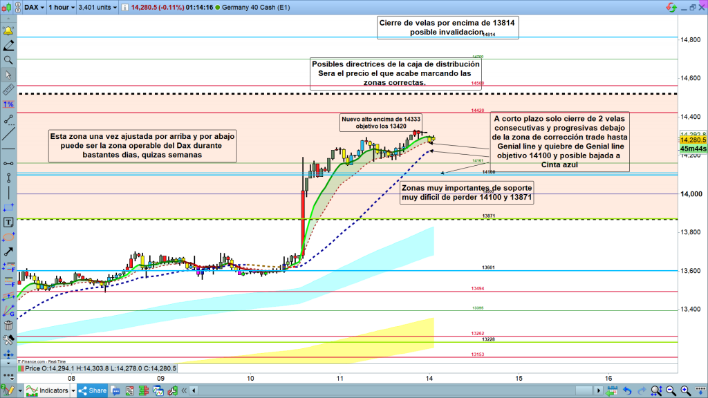 En gráfico de 1 hora del dax40, apertura semanal en la zona de los 14271, hueco con el cierre del viernes de más de 50 puntos, la sesión del domingo, en los pocos mercados abiertos, básicamente Oriente Medio, fue bajista.
