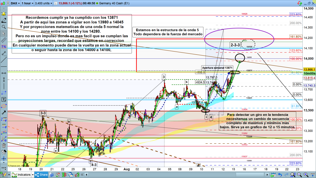 El pasado viernes, el movimiento esperado y explicado en los Flash, ya desde el martes por la noche, En los dos supuestos de corrección y en sus correspondientes proyecciones, la zona objetivo de muy alta probabilidad, en ambas proyecciones se alcanzaba el precio objetivo en la cota histórica importante, de los 13871. Justo la alcanzo en las últimas horas del cierre de la semana anterior el pasado viernes.