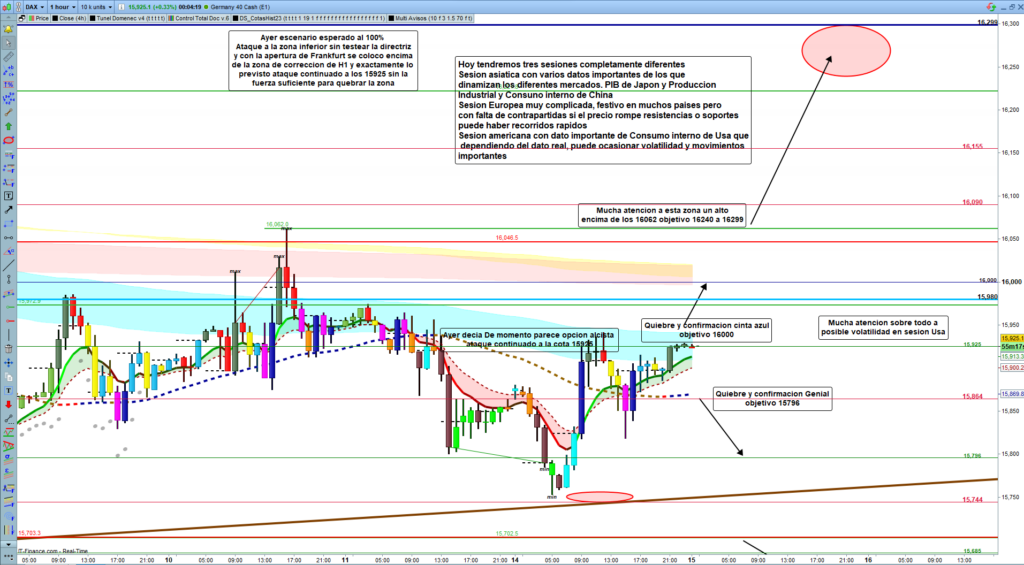 Ayer, apertura semanal en los, 15876, bajada durante sesión asiática hasta hacer mínimo en la zona de los,14752, apenas a 8 puntos de la directriz y de la cota histórica. Desde este punto se dio la vuelta, volviendo a la zona de corrección y quebrándola, desde este momento el precio actuó según el escenario previsto explicado precisamente en el flash de ayer por la noche, todo el día moviéndose en la zona entre la zona de corrección y la cota histórica de los, 15925, atacándola hasta el fin del día sin conseguir quebrar esta cota de corto plazo, en medio de la zona de la cinta azul de gráfico de H1. Esta fue toda la historia del día de ayer.