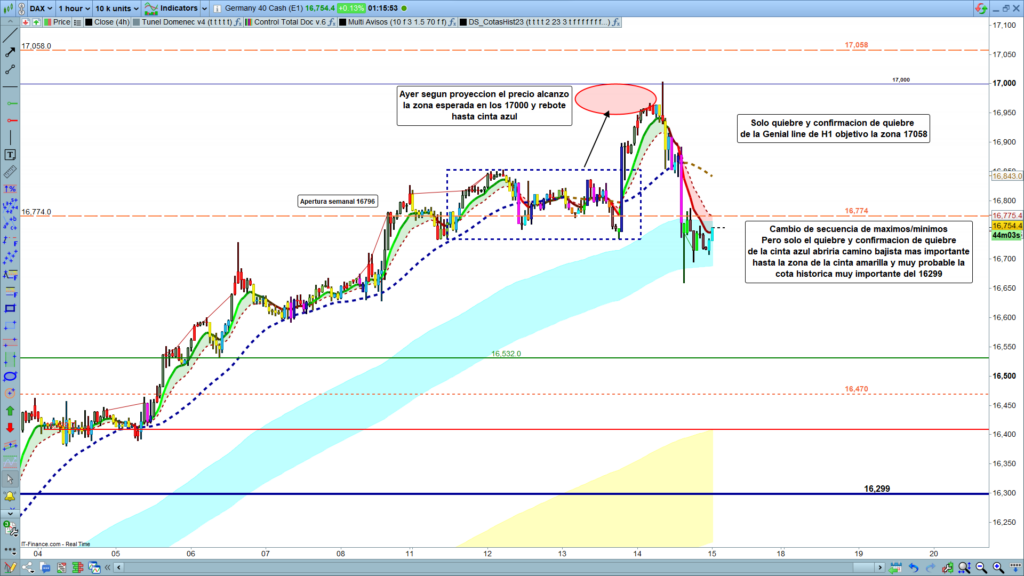 Ayer, el precio de nuevo realizó el recorrido esperado. Apertura diaria en la zona de los 16900, rally alcista hasta la zona objetivo cota psicológica de primer grado en los, 17000, para rebotar una vez alcanzado el objetivo e ir a buscar el doble patrón en la cinta azul de H1. Cierre del día en la zona de los, 16750. Interesante y muy rentable la operativa de estos recorridos, 100 puntos alcistas y 250 puntos bajistas.