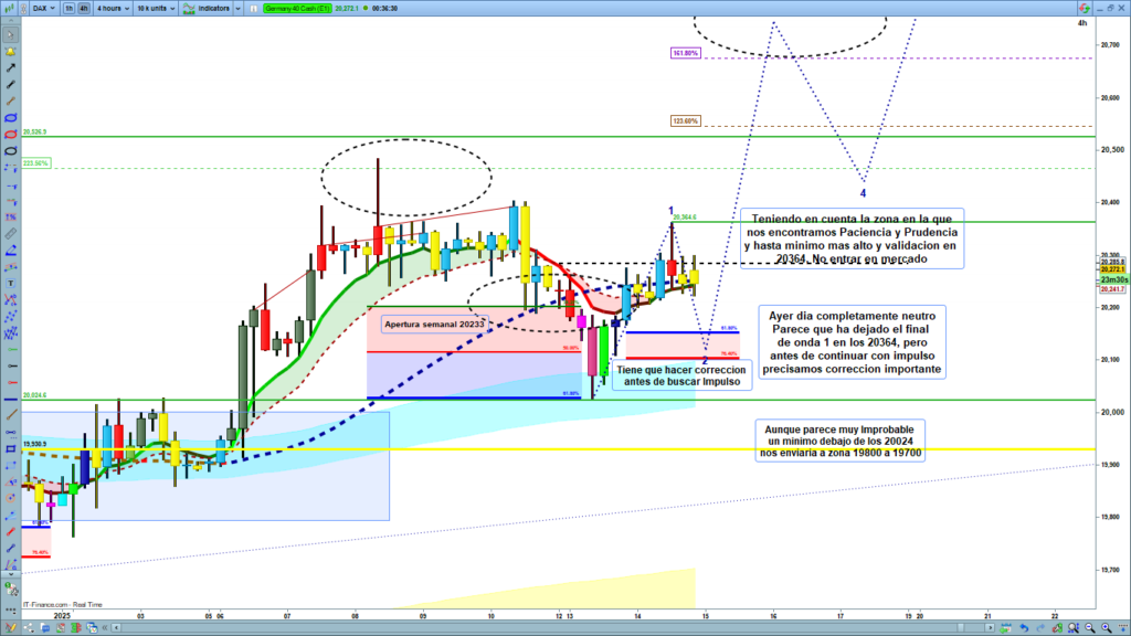 La corrección esperada debería llevar el precio hacia la zona comprendida entre los 20.160 y los 20.110 puntos, con un mínimo imprescindible en los 20.190 puntos. Solo tras alcanzar esta corrección, y siempre que el precio supere de manera clara el último máximo en 20.364 puntos, podríamos confirmar la validación estructural y proyectar un nuevo impulso alcista correspondiente a la onda 3.
