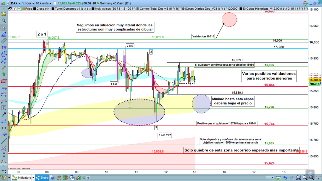 Sin embargo, lo más probable es finalizar el movimiento esperado y no ejecutado el pasado viernes, con bajada hasta la zona de los,15820, esta sin ninguna duda, será la zona clave. Si en esta zona, tuviéramos un nuevo rebote alcista, mucha atención al posible quiebre de nuevo hacia arriba de la cota histórica de los, 15864, ya que podría ser el inicio de un importante movimiento alcista.