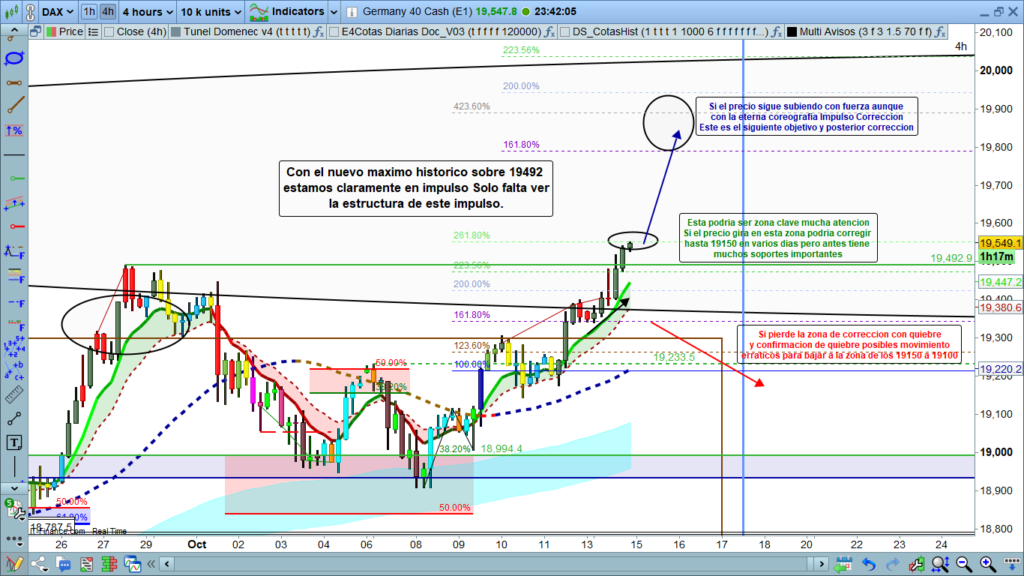 El análisis de la jornada de ayer destaca un comportamiento inusual en los mercados, ya que, a pesar del festivo en Estados Unidos y Canadá, el DAX obtuvo un rally de 150 puntos en la tarde, contrario a las expectativas de un día de baja. volatilidad. Este movimiento no solo llevó al índice a un nuevo máximo histórico, sino que también marcó el final del periodo correctivo, entrando ahora en una fase impulsiva clara.