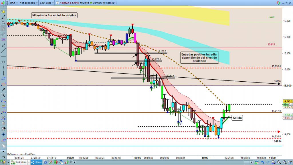 Ayer hubo varias entradas posibles, personalmente estaba dentro desde inicio de asiática en la zona 15231, con Stop Loss a 95 puntos. Para los que entraran a principios de pre apertura o apertura, dependiendo de su nivel de aversión al riesgo, tuvieron varias posibilidades. Veámoslo en gráfico de 144 seg para ajustar entradas y salidas, después de haber tomado la decisión con gráfico de 1 hora. Primera posible entrada, al confirmar la perdida de la Genial line, con un mínimo debajo del anterior mínimo en la zona de los 15100, para los más expertos o atrevidos. Segunda entrada, la más normal, con nuevo mínimo después de mínimo más bajo que el penúltimo mínimo (esto a nivel estructural es muy fiable, ya que descarta posible corrección menor, en la zona de los 15076. Y para los que tienen más aversión al riesgo, esperar él quiebre de la primera validación en 15055 y después buscar la entrada con mínimo después del anterior mínimo en la zona 15024. Para todos hasta para mí la salida no tiene dudas, alcanzada ya la parte superior del objetivo esperado, 14917, personalmente hubiera cerrado en 14814 en caso de testeo, justo cuando tenemos cierre de vela sobre la zona de corrección y la siguiente vela hace un nuevo máximo por encima de la vela anterior toma de beneficios en la zona de los 14900. esperar por estructura corrección menor o mayor y volver a buscar una entrada solo en dirección de la tendencia en este caso bajista. Personalmente, no salí a las 8,55 h, porque venía de muy arriba tenía margen y para mí viendo la hora y la estructura lo que marcaba la zona de salida era la cinta azul. Estaba controlando el trade y justo antes de las 9 h, volvía a tener el precio dentro de zona bajista y con vela de ciclo bajista, fucsia, por lo que pude seguir hasta objetivos.