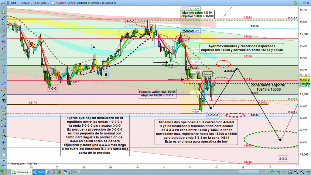 Vamos a la situación de hoy, dependerá mucho de lo que ocurra en sesión asiática con la corrección de onda 4-3-3-3, en curso. Si recordáis ayer ya decía que teníamos una diferencia entre las proyecciones de ciclo superior, para marcar la proyección final de la onda 3-3-3, entre las cotas 14560 a 14420. Y, en cambio, la cuarta extendida en curso, tenemos una onda 1-3-3-3, muy pequeña, y ayer decía que la proyección era hasta la zona 14930 a 14900 para 3-3-3-3, llego hasta 14840. Ahí el punto en cuestión de hoy, en principio, la onda correctiva 4-3-3-3, tenía su objetivo entre los 15113, ya alcanzados, por tanto, ya hemos hecho más de un 38,2% de corrección, y la zona de los 15240. La clave para la operativa de hoy estará precisamente en el final de esta onda 4-3-3-3, no solo por la dirección operable, sino para tener más clara, la proyección final de este movimiento onda 3-3-3. Si no tenemos nuevo alto, la zona proyectada será 14700 a 14560. Si, por el contrario, tenemos nueva estructura hasta la zona 15240 a 15280, quizás pluma a 15300. Tendríamos un recorrido para finalizar 3-3-3, más cerca de la zona 14814, que de la zona 14560.