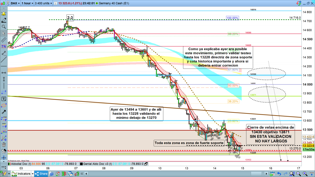 Para hoy, tenemos dos espacios temporales claros a la hora de operar. Desde el inicio de sesión asiática hasta las 18 h, con una operativa normal, aunque si es corrección alcista, podría ser sin fuerza y errática esperando los discursos y datos de la tarde. O quizás no, quizás dada la fuerza de todos estos días, si alcanza la zona de validación, podremos tener movimientos claros, alcistas, dada la falta de correcciones de cierta importancia durante todo el impulso bajista. La zona de validación la tendremos con cierre de velas de gráfico de 1 hora por encima de los 13430, velas consecutivas y progresivas con cierres más altos que la anterior.