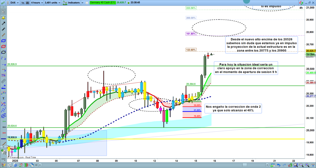 Tras alcanzar un nuevo máximo histórico ayer, superando los 20.526 puntos, no queda duda de que estamos inmersos en un nuevo impulso alcista. La estructura actual proyecta como primera zona objetivo la región comprendida entre los 20.765 y los 20.900 puntos. Este rango podría marcar una pausa antes de continuar el movimiento hacia niveles superiores.