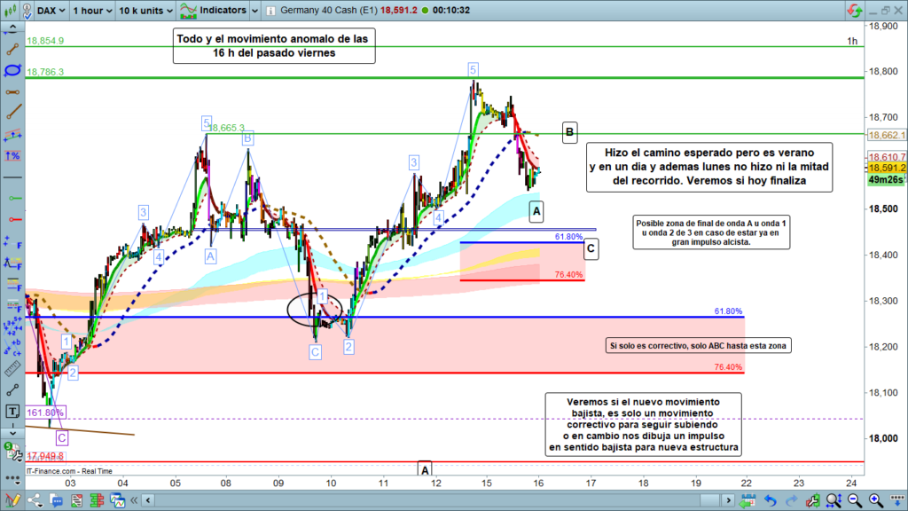 En gráfico de una hora del DAX 40, vemos como el comportamiento del precio del día de ayer fue típico de un lunes y además de un lunes de verano a mediados del mes de julio. Del movimiento estructural esperado, con objetivo en las zonas entre los 18460 y los 18410, como recorrido menor, el precio apenas dibujo la primera parte de esta estructura.