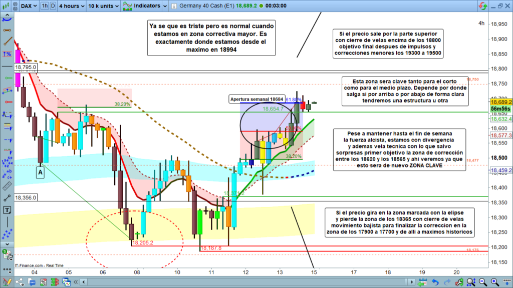 Por lo demás, es repetir exactamente el mismo flash que ya hice el viernes pasado. En el caso de tener un claro quiebre de la zona superior con cierre de velas por encima de la zona de los, 18800, muy posiblemente el objetivo sería nuevo máximo histórico e ir deambulando con impulso corrección, impulso corrección, hasta la zona de los, 19300 a 19500.
