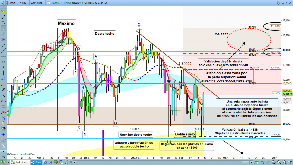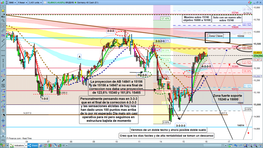 En gráfico diario, como cada día, se ve mucho mejor, tanto lo acaecido ayer, con la vela de las 9 h, de 200 puntos, y a partir de ahí movimientos normales. Podemos ver, las dos alternativas esperables durante sesión asiática e inicio de sesión europea. Finalización de la corrección y de nuevo impulso bajista, o que falte aún un doble movimiento para onda 4 y onda 5, antes de finalizar el movimiento en la zona de los 15465, correspondiente a la proyección del 161,8%de AB. Paciencia y esperar que el mercado enseñe el camino. En el caso de tener movimiento más alcista por encima de la zona del 15465, antes debería haber una corrección onda 4 bajista antes de atacar la zona de los 15600. Solo operativa scalping y con cuidado, ya que estamos en zona de más que posibles cambios de dirección. Tanto si estamos en onda 1 bajista onda 2 correctivas, como si los 15465, fueran únicamente onda 3, faltando una onda 4 bajistas y otra 5 alcista, la zona tiene números de lateralizar en un rango de 100 a 150 puntos tanto por arriba como por abajo antes de volver a tener otro latigazo con recorridos importantes. Muchísima suerte y muy buenos trades.